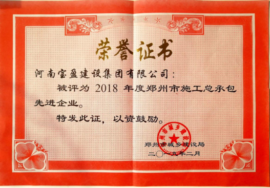 2018年度郑州施工总承包先进企业